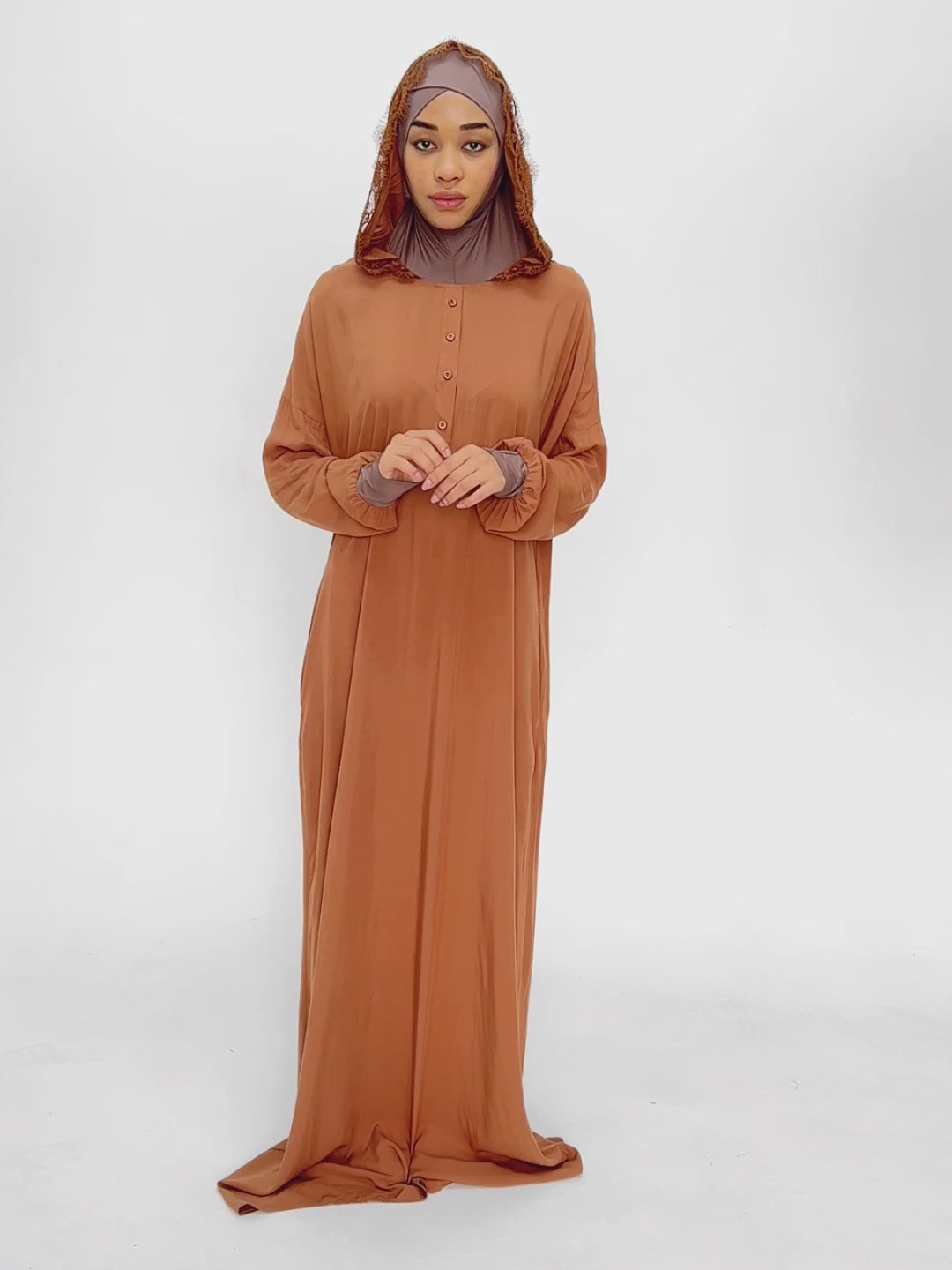 Kindly be advised that our AUTUMN BLAZE prayer dresses in current stock are in the same exact color as in the photos, however there may be a small difference in the shade of the undercap and cuffs (sleeve ends). Everything is handmade so sometimes tiny variations like these happen. Please take note of this. JazakAllah Khayran.