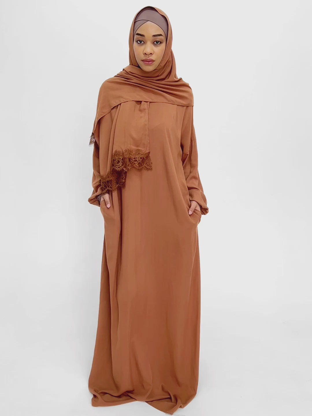This is our prayer gown with a built-in underscarf and an elegant complimentary scarf.