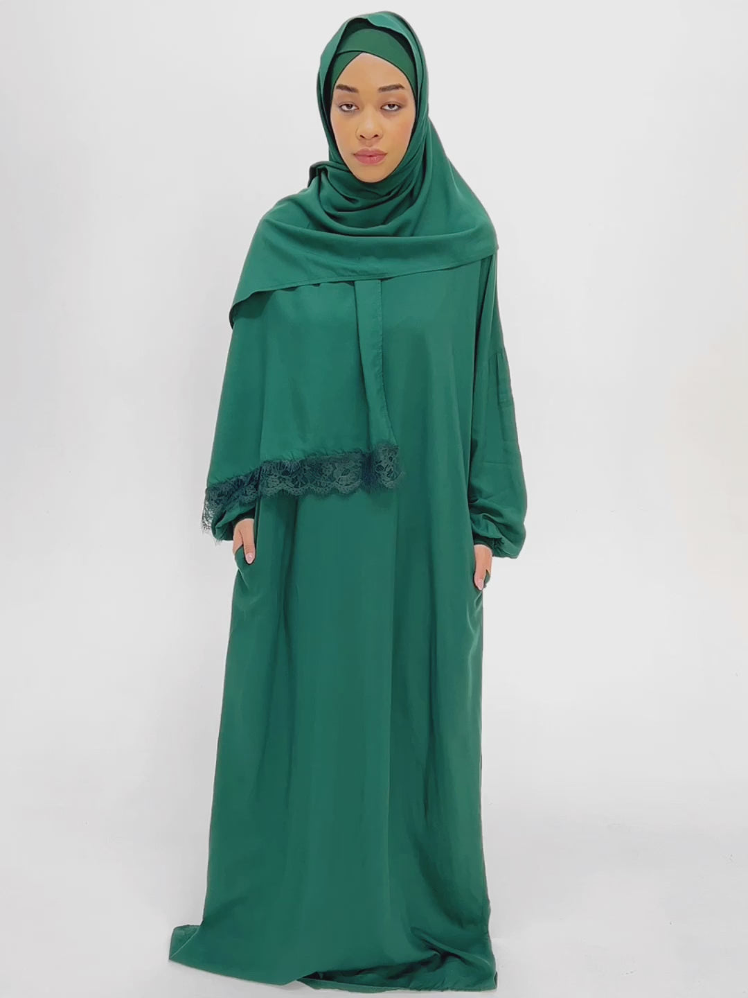 This is our prayer gown with a built-in underscarf and an elegant complimentary scarf.