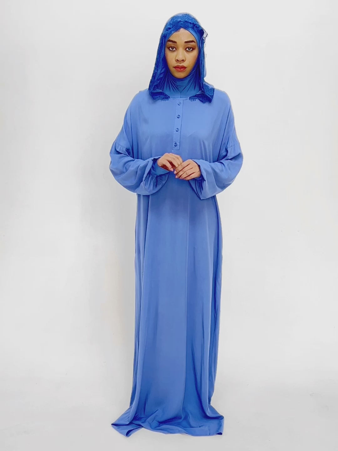 This is our prayer gown with a built-in underscarf and an elegant hood in place of a hijab.
